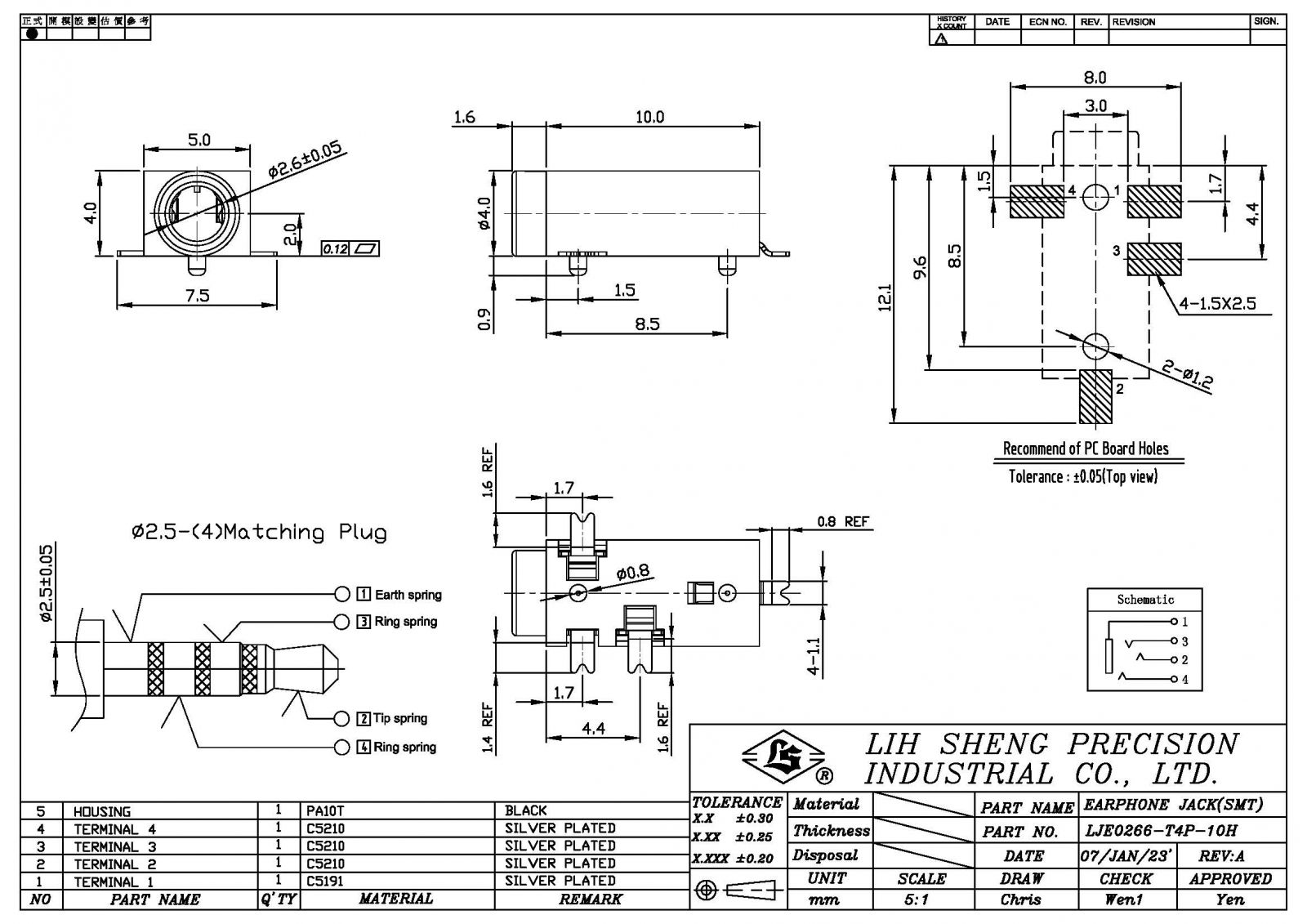 Discover the LJE0266, an exceptional 2.5mm Audio Jack SMT Type by Lih Sheng Precision, a distinguished audio jacks manufacturer and supplier. Our compact TRS connector ensures seamless sound across devices, making it perfect for tight spaces. Designed for clear stereo audio and even microphone input, it's ideal for phones, audio players, and compact radios. As technology shifts to smaller connectors, the 2.5mm jack remains indispensable for compact audio. Elevate your audio experience with the LJE0266—a small package delivering outstanding sound. Choose Lih Sheng Precision, the leading audio jacks manufacturer.